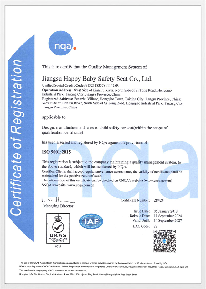 Az iparág vezető gyártójaként JIANGSU HAPPY BABY SAFETY SEAT CO., LTD. a gyermekek biztonságára specializálódott, és megérti, hogy a védelem nem csupán szabványok vagy tanúsítványok halmaza, hanem felelősség és elkötelezettség. Reméljük, hogy nem csak a biztonsági gyermekülések gyártói leszünk, hanem a családok megbízható védői is. Minden univerzális autósülés A család megértésén és az élet iránti tiszteleten alapul. Szigorú fizikai és kémiai vizsgálatokkal biztosítjuk, hogy termékeink megbízható védelmezők legyenek minden utazás során.
